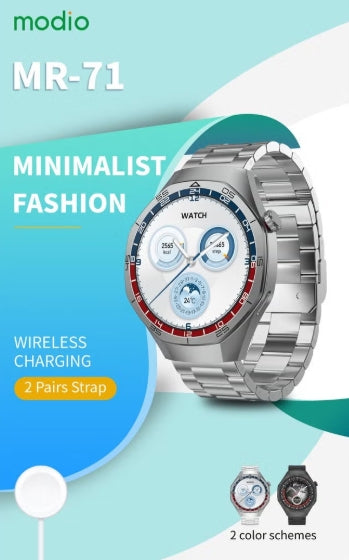 Experience premium design and intelligent features with the Modio MR-71 Smart Watch. With a sleek, modern analog-inspired dial, dual-strap option, and comprehensive health tracking, the MR-71 blends style with function. Designed for the active lifestyle, this smartwatch keeps you connected, informed, and healthy—all from your wrist.